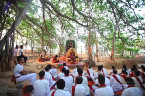 (Above) The Supreme Pontiff of Hinduism Nithyānanda Paramashivam often conducts Hindu health care and yoga classes under the Sacred Banyan tree. In Ayurveda, the banyan tree is believed to heal many diseases and infections. It has medicinal properties apart from its rich oxygen emission. Impregnated with healing energy, this space heals at the physical, emotional and spiritual levels.
