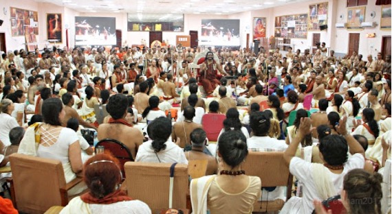 (left) An important class takes places as hundreds of KAILᾹSA’s NHU students gather around the SPH as He reveals the science of corporate success and techniques of practicing conflict-free living through the curricula of KAILᾹSA’s NHU Hindu Management Science.